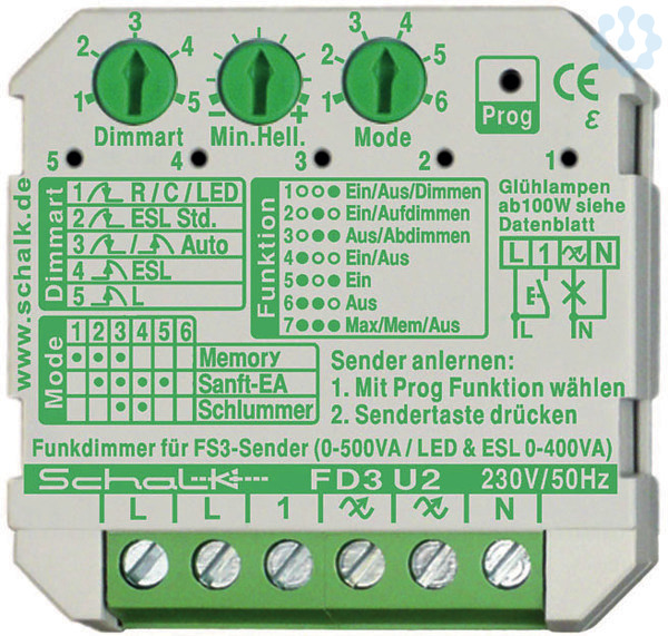 Mit dem ektronischen Funk-Universal-Tastdimmer FD3 U2 im äußerst kompakten Doseneinbaugehäuse lassen sich nahezu alle Leuchtmittel (LED-, Energiespar-, Glühlampen, NV-Halogenlampen mit Tronic- oder gewickelten Trafos, HV-Halogenlampen) dimmen, welche für Phasenan- oder abschnittsteuerung geeignet sind. Die korrekte Dimmart kann automatisch erkannt, oder auch manuell auf Phasenan- oder Phasenabschnitt eingestellt werden. Eine spezielle ESL-Dimmart erzeugt zusätzlich eine Zünd- und Aufwärmphase für Kompaktleuchtstofflampen (?Energiesparlampen?). Der Tastereingang und die Funk-Funktionen sind individuell programmierbar (7 Schalt- und Dimmfunktionen). Somit ist eine Einzelsteuerung wie auch eine Gruppensteuerung sehr flexibel möglich (Ein- oder Zweitastensteuerung, Ein-/Ausschalten mit/ohne Dimmfunktion, etc.). Die Aktivierung von Helligkeitspeicher, Schlummer- und Sanft-Ein/Aus-Funktion, und die Anpassung der Mindesthelligkeit erfolgen direkt über die Einsteller.. Auch als einfache Variante ohne spezielle Progra