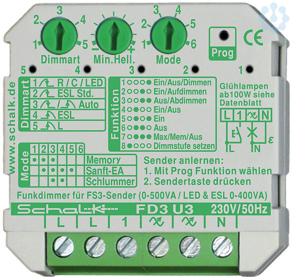 Mit dem elektronischen Funk-Universal-Tastdimmer FD3 U3 im äußerst kompakten Doseneinbaugehäuse lassen sich nahezu alle Leuchtmittel (LED-, Energiespar-, Glühlampen, NV-Halogenlampen mit Tronic- oder gewickelten Trafos, HV-Halogenlampen) dimmen, welche für Phasenan- oder abschnittsteuerung geeignet sind. Die korrekte Dimmart kann automatisch erkannt, oder auch manuell auf Phasenan- oder Phasenabschnitt eingestellt werden. Eine spezielle ESL-Dimmart erzeugt zusätzlich eine Zünd- und Aufwärmphase für Kompaktleuchtstofflampen (?Energiesparlampen?). Der Tastereingang und die Funk-Funktionen sind individuell programmierbar (7 Schalt- und Dimmfunktionen, zusätzliche Funktion für SmartHome-Steuerung Fx3smart). Somit ist eine Einzelsteuerung wie auch eine Gruppensteuerung sehr flexibel möglich (Ein- oder Zweitastensteuerung, Ein-/Ausschalten mit/ohne Dimmfunktion, etc.). Die Aktivierung von Helligkeitspeicher, Schlummer- und Sanft-Ein/Aus-Funktion, und die Anpassung der Mindesthelligkeit erfolgen direkt über die Eins