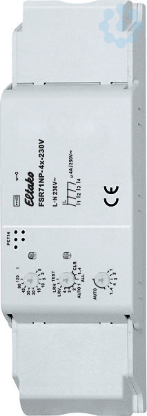 Stromstoß-Schaltrelais mit 4 Kanälen, je 1 Schließer nicht potenzialfrei 4A/250V AC. Mit Lichtszenensteuerung über PC oder mit Funktastern. Verschlüsselter Funk, bidirektionaler Funk und Repeater-Funktion zuschaltbar. Stand-by-Verlust nur 0,8 Watt. Montage in die 230V-Netzanschlussleitung, zum Beispiel in Zwischendecken und Leuchten. 166mm lang, 46mm breit und 31mm hoch. Mit Kabel-Zugentlastung. Beim Ausfall der Versorgungsspannung wird definiert ausgeschaltet. Die Kanäle können unabhängig voneinander als ES- oder ER-Kanal eingelernt werden. Szenen-Steuerung: Mit einem der vier Steuersignale eines als Szenentaster eingelernten Tasters mit Doppelwippe können mehrere Kanäle eines oder mehrerer FSR71NP-4x zu je einer Szene ein- bzw. ausgeschaltet werden. Zentralbefehle am PC werden mit der Gebäudefunk-Visualisierungs- und Steuerungs-Software GFVS gesendet. Hierzu am PC einen oder mehrere FSR71NP-4x einlernen. Mit den Drehschaltern werden die Taster eingelernt und gegebenenfalls die 4 Kanäle getestet. Für den Nor