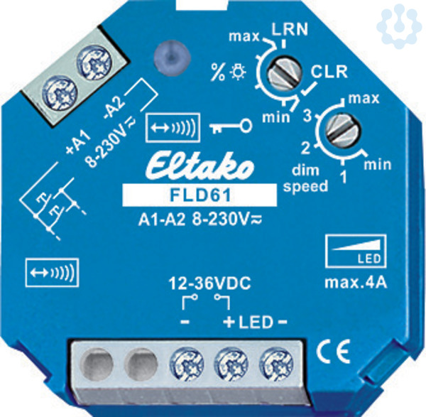 PWM-Dimmschalter für LED 12-36VDC, bis 4A. Stand-by-Verlust nur 0,2-0,4 Watt. Mindesthelligkeit und Dimmgeschwindigkeit einstellbar. Mit Kinderzimmer- und Schlummerschaltung. Zusätzlich mit Lichtszenensteuerung über PC oder mit Funktastern. Verschlüsselter Funk, bidirektionaler Funk und Repeater-Funktion zuschaltbar. Für Einbaumontage. 45mm lang, 45mm breit, 33mm tief. Versorgungsspannung 12 bis 36V DC, abhängig von der angeschlossenen LED-Beleuchtung. Ausgangsspannung PWM (Puls-Weiten-Modulation). Ausgangsstrom maximal 4A. Es wird ein impulsfestes DC-Netzteil benötigt, welches die erforderliche Spannung und den erforderlichen Strom der LED-Lampe(n) liefert. Universal-Steuerspannung 8..230V UC, galvanisch getrennt von der Versorgungs- und Schaltspannung. Die eingestellte Helligkeitsstufe bleibt beim Ausschalten gespeichert (Memory). Bei einem Stromausfall werden die Schaltstellung und die Helligkeitsstufe gespeichert und wird gegebenenfalls bei Wiederkehr der Versorgungsspannung eingeschaltet. Automatische el