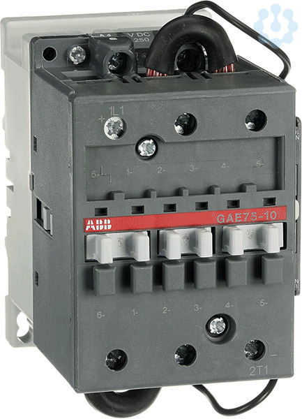 Das GAE75 ist ein einpoliges Schütz, bei dem die an den Anschlussklemmen angegebenen Polaritäten eingehalten werden müssen. Es ist ferner mit 1L1 für den Pluspol und 2T1 für den Minuspol gekennzeichnet. Werksseitig sind keine Hilfskontakte installiert.