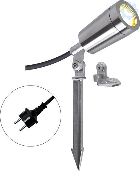Die V4A-Edelstahl Leuchte kann entweder mittels des montierten Edelstahl-Stativs direkt auf dem Untergrund, oder optional mit dem mitgeliefertem Erdspieß im weichen Untergrund montiert werden. Das mitgelieferte GU10-LED-Leuchtmittel ist ueber Phasenan- und Phasenabschnitt dimmbar (nicht fuer elektrische Dimmer geeignet) und kann bei Bedarf jederzeit ausgetauscht werden. Am Strahler befindet sich eine 1,7m lange Anschlussleitung mit einen Schutzkontaktstecker. Der Erdspieß hat eine Länge von 195mm.