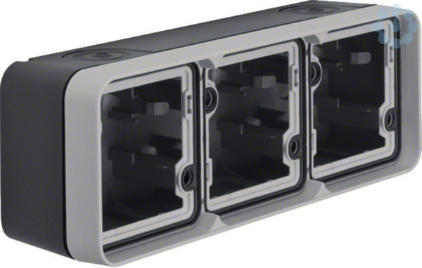 Gehäuseunterteil 3fach waagerecht mit Rahmen und Leitungseinf. AP W.1 grau. Gehäuse 3-fach waagerecht, mit Rahmen AP. Für waagerechte Montage, mit einer Einführung für 2 Leitungen und 2 Einführungen für Leitung oder Rohr, Vollflächige Dichtung unter dem Gehäuseboden zur Abdichtung der Gehäuserückseite, eine Wago 2-Leiter Verbindungsklemme für Verdrahtung beiliegend, zwei Einrastplätze für Wago 2-Leiter Verbindungsklemmen im Gehäuseboden. Nur bei Montage mit einem modularen Einsatz AP/UP der Produktlinie W.1 wird der Schutzgrad IP55 erreicht.