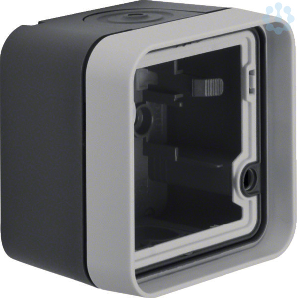 Gehäuseunterteil 1fach mit Rahmen und Leitungseinführungen AP W.1 grau. Gehäuse mit Rahmen AP, mit einer Einführung für 2 Leitungen und einer Einführung für Leitung oder Rohr, vollflächige Dichtung unter dem Gehäuseboden zur Abdichtung der Gehäuserückseite, eine Wago 2-Leiter Verbindungsklemme für Verdrahtung beiliegend, zwei Einrastplätze für Wago 2-Leiter Verbindungsklemmen im Gehäuseboden. Nur bei Montage mit einem modularen Einsatz AP/UP der Produktlinie W.1 wird der Schutzgrad IP55 erreicht.