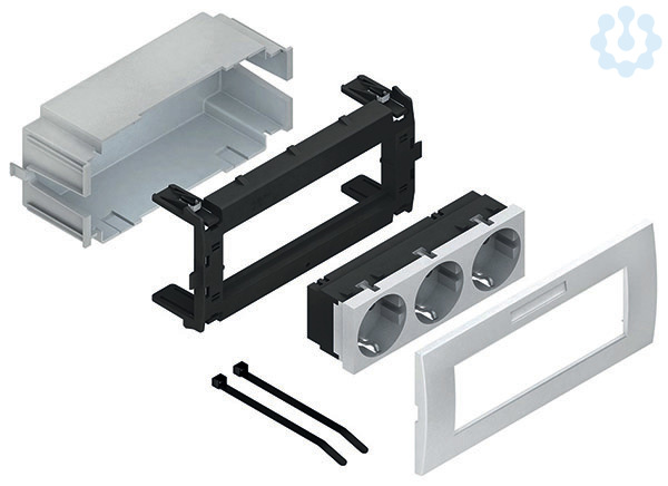 Geräteeinbausystem, vorkonfektioniert, dreifach, waagerecht, anschlussfertig vorverdrahtet, komplett mit Adapter- und Abdeckrahmen, mit Steckdoseneinsatz für Allgemeinstromkreise, zum Aufrasten in die Deckelaufnahmekontur der Gerätekanäle. Empfohlen bei normaler Beanspruchung. Für besondere Beanspruchungen (z.B. Schulen, Werkstätten, Sporthallen) empfehlen wir die Verwendung unserer Geräteeinbaudosen GDM 50... in Verbindung mit einem adäquaten Schalterprogramm. Der Querschnitt ca. 2880 mm² ist vom nutzbaren Querschnitt des Gerätekanals abzuziehen. Set besteht aus: 1 x Schutzdose, dreifach, grau 1 x Geräteadapter, dreifach, Modul 45, mit 4 Federclips 1 x Steckdoseneinsatz, dreifach, waagerecht, mit Steckklemmen für Leitungen 1,5 - 2,5 mm², 2-polig, mit Berührungsschutz 1 x Abdeckrahmen, dreifach, Modul 45, einschließlich Sichtfenster mit Etikett für Beschriftungsfeld 2 x Kabelbinder für die Zugentlastung 1 x Montageanleitung Verwendung für : Gerätekanalunterteile GKU ..., DKU ...