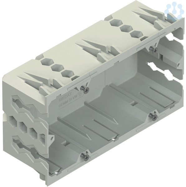 Geräteeinbaudose, zweifach, frontrastend, vormontiert, bestehend aus linkem, rechtem und Erweiterungsmodul, zur Befestigung in der Deckelaufnahmekontur von Gerätekanälen, seitliche hexagonale Kabeldurchführöffnungen ermöglichen eine wirksame Kabelrückhaltung bei gängigen Leitungen wie NYM 3x1,5 mm² und NYM 3x2,5 mm², mit 60 mm Befestigungsspur, zur Aufnahme von Einbaugeräte mit 80 mm Abdeckrahmen, beliebig erweiterbar zu 3-, 4-fach usw. unter Verwendung des Erweiterungsmoduls GDMM 50 VW, halogenfrei. Der Querschnitt ca. 2702 mm² ist vom nutzbaren Querschnitt des Gerätekanals abzuziehen. Verwendung für : Gerätekanalunterteile GKU ..., DKU ... Pultkanalunterteile PGU ..., PLU ... Aluminiumkanalunterteile GAU ..., DAU ... Energiesäulen ESDB 133/..., ESED 133/..., ESDD 133/... Abmessungen (ca. Maße) Höhe H : 80 mm Breite B
