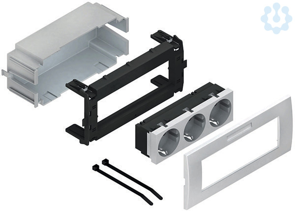Geräteeinbausystem, vorkonfektioniert, dreifach, waagerecht, anschlussfertig vorverdrahtet, komplett mit Adapter- und Abdeckrahmen, mit Steckdoseneinsatz für Allgemeinstromkreise, zum Aufrasten in die Deckelaufnahmekontur der Gerätekanäle. Empfohlen bei normaler Beanspruchung. Für besondere Beanspruchungen (z.B. Schulen, Werkstätten, Sporthallen) empfehlen wir die Verwendung unserer Geräteeinbaudosen GDHR... in Verbindung mit einem adäquaten Schalterprogramm. Der Querschnitt ca. 2880 mm² ist vom nutzbaren Querschnitt des Gerätekanals abzuziehen. Set besteht aus: 1 x Schutzdose, dreifach, grau 1 x Geräteadapter, dreifach, Modul 45, mit 4 Federclips 1 x Steckdoseneinsatz, dreifach, waagerecht, mit Steckklemmen für Leitungen 1,5 - 2,5 mm², 2-polig, mit Berührungsschutz 1 x Abdeckrahmen, dreifach, Modul 45, einschließlich Sichtfenster mit Etikett für Beschriftungsfeld 2 x Kabelbinder für die Zugentlastung 1 x Montageanleitung für Gerätekanalunterteile : GKU ... DKU ...