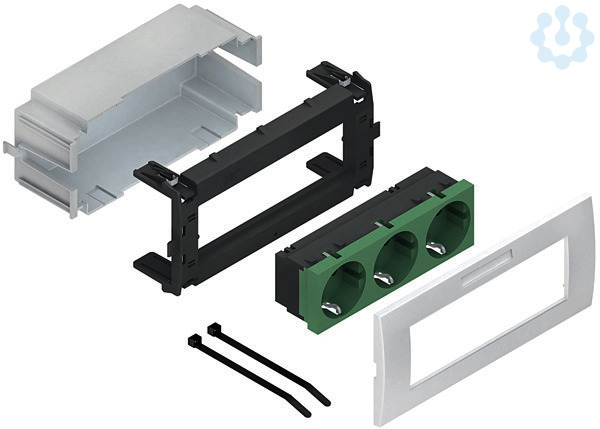 Geräteeinbausystem, vorkonfektioniert, dreifach, waagerecht, anschlussfertig vorverdrahtet, komplett mit Adapter- und Abdeckrahmen, mit Steckdoseneinsatz für Sicherheitsstromversorgung, zum Aufrasten in die Deckelaufnahmekontur der Gerätekanäle. Empfohlen bei normaler Beanspruchung. Für besondere Beanspruchungen (z.B. Schulen, Werkstätten, Sporthallen) empfehlen wir die Verwendung unserer Geräteeinbaudosen GDHR... in Verbindung mit einem adäquaten Schalterprogramm. Der Querschnitt ca. 2880 mm² ist vom nutzbaren Querschnitt des Gerätekanals abzuziehen. Set besteht aus: 1 x Schutzdose, dreifach, grau 1 x Geräteadapter, dreifach, Modul 45, mit 4 Federclips 1 x Steckdoseneinsatz, dreifach, waagerecht, mit Steckklemmen für Leitungen 1,5 - 2,5 mm², 2-polig, mit Berührungsschutz 1 x Abdeckrahmen, dreifach, Modul 45, einschließlich Sichtfenster mit Etikett für Beschriftungsfeld 2 x Kabelbinder für die Zugentlastung 1 x Montageanleitung für Gerätekanalunterteile : GKU ... DKU ...