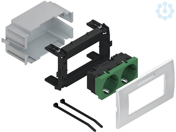 Geräteeinbausystem, vorkonfektioniert, zweifach, waagerecht, anschlussfertig vorverdrahtet, komplett mit Adapter- und Abdeckrahmen, mit Steckdoseneinsatz für Sicherheitsstromversorgung, zum Aufrasten in die Deckelaufnahmekontur der Gerätekanäle. Empfohlen bei normaler Beanspruchung. Für besondere Beanspruchungen (z.B. Schulen, Werkstätten, Sporthallen) empfehlen wir die Verwendung unserer Geräteeinbaudosen GDHR... in Verbindung mit einem adäquaten Schalterprogramm. Der Querschnitt ca. 2880 mm² ist vom nutzbaren Querschnitt des Gerätekanals abzuziehen. Set besteht aus: 1 x Schutzdose, zweifach, grau 1 x Geräteadapter, zweifach, Modul 45, mit 4 Federclips 1 x Steckdoseneinsatz, zweifach, waagerecht, mit Steckklemmen für Leitungen 1,5 - 2,5 mm², 2-polig, mit Berührungsschutz 1 x Abdeckrahmen, zweifach, Modul 45, einschließlich Sichtfenster mit Etikett für Beschriftungsfeld 2 x Kabelbinder für die Zugentlastung 1 x Montageanleitung für Gerätekanalunterteile : GKU ... DKU ...