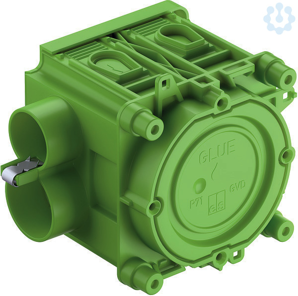 Geräteverbindungsdose für die liegende Werksfertigung, 1-teilig, 71 x 71 x 68mm, Durchmesser 60mm , mit vergrößertem Anschlussraum, 4 Schraubdome mit Schraubabstand 60mm, kombinierbar, mit Krallenbefestigung, kombinierbar im Normabstand 71mm, geeignet auch für Gegenschalung, VDE zertifiziert nach DIN EN 60670 (VDE 0606), mit Spezialfrontteil zur Klebebefestigung