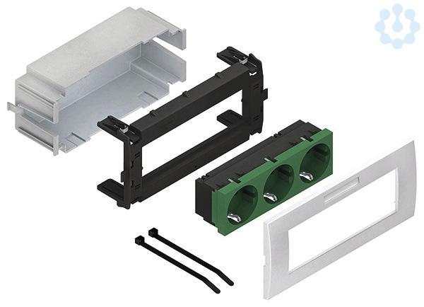 Geräteeinbausystem, vorkonfektioniert, dreifach, waagerecht, anschlussfertig vorverdrahtet, komplett mit Adapter- und Abdeckrahmen, mit Steckdoseneinsatz für Sicherheitsstromversorgung, zum Aufrasten in die Deckelaufnahmekontur der Gerätekanäle. Empfohlen bei normaler Beanspruchung. Für besondere Beanspruchungen (z.B. Schulen, Werkstätten, Sporthallen) empfehlen wir die Verwendung unserer Geräteeinbaudosen GDHR... in Verbindung mit einem adäquaten Schalterprogramm. Der Querschnitt ca. 2880 mm² ist vom nutzbaren Querschnitt des Gerätekanals abzuziehen. Set besteht aus: 1 x Schutzdose, dreifach, grau 1 x Geräteadapter, dreifach, Modul 45, mit 4 Federclips 1 x Steckdoseneinsatz, dreifach, waagerecht, mit Steckklemmen für Leitungen 1,5 - 2,5 mm², 2-polig, mit Berührungsschutz 1 x Abdeckrahmen, dreifach, Modul 45, einschließlich Sichtfenster mit Etikett für Beschriftungsfeld 2 x Kabelbinder für die Zugentlastung 1 x Montageanleitung für Gerätekanalunterteile : GKU ... DKU ...