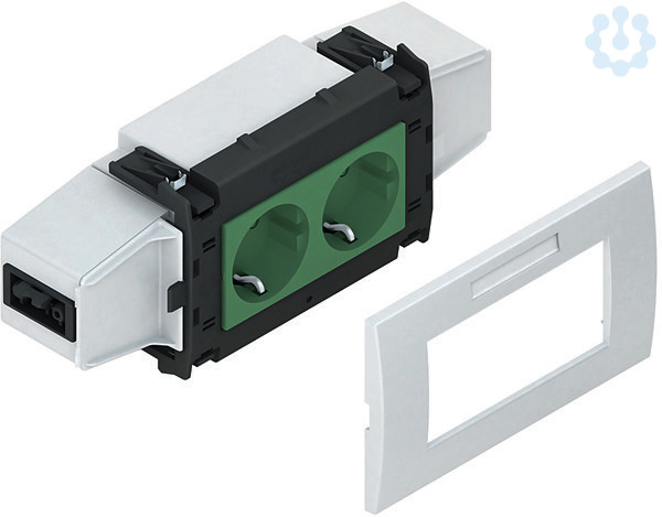 Geräteeinbausystem, vorkonfektioniert, zweifach, waagerecht, anschlussfertig vorverdrahtet, komplett mit Adapter- und Abdeckrahmen, mit Steckdoseneinsatz für Sicherheitsstromversorgung, der Anschluss erfolgt über vorkonfektionierte Leitungen mit GST18i 3-poligen Stecker- und Buchsenenden, zum Aufrasten in die Deckelaufnahmekontur der Gerätekanäle. Empfohlen bei normaler Beanspruchung. Für besondere Beanspruchungen (z.B. Schulen, Werkstätten, Sporthallen) empfehlen wir die Verwendung unserer Geräteeinbaudosen GDHR... in Verbindung mit einem adäquaten Schalterprogramm. Der Querschnitt ca. 2880 mm² ist vom nutzbaren Querschnitt des Gerätekanals abzuziehen. Set besteht aus: 1 x Schutzdose, zweifach, grau 1 x Geräteadapter, zweifach, Modul 45, mit 4 Federclips 1 x Steckdoseneinsatz, zweifach, waagerecht, mit vorkonfektioniertem Stecker- und Buchsenteil 1 x Abdeckrahmen, zweifach, Modul 45, einschließlich Sichtfenster mit Etikett für Beschriftungsfeld 1 x Montageanleitung für Gerätekanalunterteile : GKU ...
