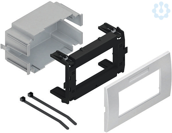 Geräteeinbausystem, Leerdose, zweifach, waagerecht, komplett mit Adapter- und Abdeckrahmen, für Einbaugeräte mit Abmessungen 45 x 45 mm, zum Aufrasten in die Deckelaufnahmekontur der Gerätekanäle. Empfohlen bei normaler Beanspruchung. Für besondere Beanspruchungen (z.B. Schulen, Werkstätten, Sporthallen) empfehlen wir die Verwendung unserer Geräteeinbaudosen GDHR... in Verbindung mit einem adäquaten Schalterprogramm. Der Querschnitt ca. 2880 mm² ist vom nutzbaren Querschnitt des Gerätekanals abzuziehen. Set besteht aus: 1 x Schutzdose, zweifach, grau 1 x Geräteadapter, zweifach, Modul 45, mit 4 Federclips 1 x Abdeckrahmen, zweifach, Modul 45, einschließlich Sichtfenster mit Etikett für Beschriftungsfeld 2 x Kabelbinder für die Zugentlastung für Gerätekanalunterteile : GKU ... DKU ... PGU ... PLU ... GAU ... DAU ... ESDB 1