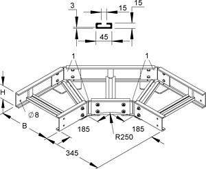 GFK-Bogen 90°, pultrudiert, mit nach oben offenen ungelochten Sprossen aus C-Profil mit ca. 15 mm Schlitzweite, anteilmäßiges Befestigungszubehör bitte gesondert bestellen, halogenfrei. Bei der Montage ist darauf zu achten, dass der Bogen an jedem Kabelleiterzugang mit Auslegern unterstützt wird. Um eine ordnungsgemäße Montage zu gewährleisten, müssen die Verbinder an jedem Kabelrinnenzugang mit 4 FKM 6x20 E4 verschraubt sein. Die Stoßstellenverbinder ULGH 80... und ULIH 80 E4 sind nicht im Lieferumfang enthalten und müssen separat bestellt werden. für GFK-Kabelleiter : UL 80... ULL 80... Abmessungen (ca. Maße) H x B : 80 x 200 mm Radius : 250 mm Werkstoff : UP-GF (glasfaserverstärkter Polyester) Farbton : kieselgrau RAL : 7032 (ähnlich)