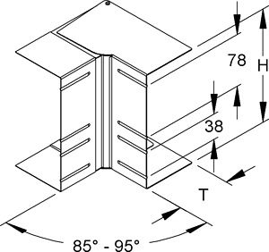 Gerätekanal-Inneneck, verstellbar, schwenkbare Schenkel ermöglichen einen Ausgleich von Winkeltoleranzen im Bereich von 85°-95°, aus bandverzinktem Stahl nach DIN EN 10346, zum Aufsetzen auf den Gerätekanal, Potentialausgleichsleitung GSLH... und zwangsläufig kontaktierende Stoßstellenverbinder DSTA... oder Potentialausgleichsklemme GPK 63 müssen gesondert bestellt werden. für Gerätekanal : DKU 170-78T80 S für Abmessungen (ca. Maße) H x T : 170 x 80 mm für Deckelöffnung : 78 mm / 38 mm