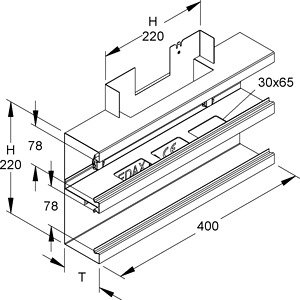 Doppelzügiges T-Stück 90°, aus bandverzinktem Stahl nach DIN EN 10346, Sichtflächen in RAL 9001 Farbton cremweiß gemäß Herstellerkatalog elektrostatisch pulverbeschichtet, ohne Bodenlaschen für die Aufnahme der Trennstege, mit zwei mittels nachträglich montierbarem, selbstkontaktierenden Trennprofil aus Aluminium mit Kabeldurchführöffnungen getrennten, gleich großen Leitungszügen, der Potentialausgleich erfolgt über die Potentialausgleichsleitung GSLH... und den Stoßstellenverbinder DSTA... oder die Potentialausgleichsklemme GPK 63, wenn diese elektrisch mit dem Kanalunterteil verbunden werden, Zubehör für den Potentialausgleich muss gesondert bestellt werden. Durchgehende Kanalhöhe = abgehende Kanalhöhe! VDE zertifiziert! Abmessungen (ca. Maße) H x T : 220 x 80 mm Länge : 400 mm Deckelöffnungen : 78 mm + 78 mm Teilung der Leitungszüge : 110 mm + 110 mm Farbton : cremeweiß RAL : 9001