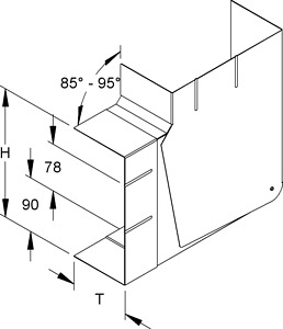 Gerätekanal-Vertikaleck, verstellbar, asymmetrisch mit einem Abgang nach oben, schwenkbare Schenkel ermöglichen einen Ausgleich von Winkeltoleranzen im Bereich von 85°-95°, aus bandverzinktem Stahl nach DIN EN 10346, Sichtflächen in RAL Farbton gemäß Herstellerkatalog elektrostatisch pulverbeschichtet, zum Aufsetzen auf den Gerätekanal, Potentialausgleichsleitung GSLH... und zwangsläufig kontaktierende Stoßstellenverbinder GSTA... oder Potentialausgleichsklemme GPK 63 müssen gesondert bestellt werden. für Gerätekanal : GKU 213A78T100 C für Abmessungen (ca. Maße) H x T : 213 x 100 mm für Deckelöffnung : 78 mm (asymmetrisch) Abgang nach oben Farbton : weißaluminium RAL : 9006