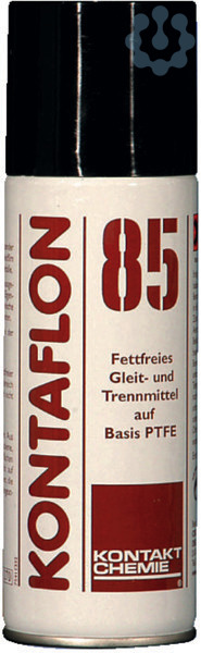 PTFE-Gleit- und Antihaftmittel. Hohe Materialverträglichkeit. Breiter Temperaturbereich. Fett- und ölfrei, nicht schmutzend. Universell verwendbar. Von -195 °C bis +260 °C einsetzbar. KONTAFLON 85 - das fettfreie Gleit- und Antihaftmittel auf PTFE - Basis. Es bildet einen sauberen, dünnen Gleit- und Trennfilm, der wasserabstoßend wirkt, Schmutz nicht anzieht und bis 260 °C temperaturbeständig ist. KONTAFLON 85 wird als Gleitmittel für Kunststoff und Kabel, als Trockenschmierstoff für Laufwerke oder als universelles Antihaftmittel eingesetzt.