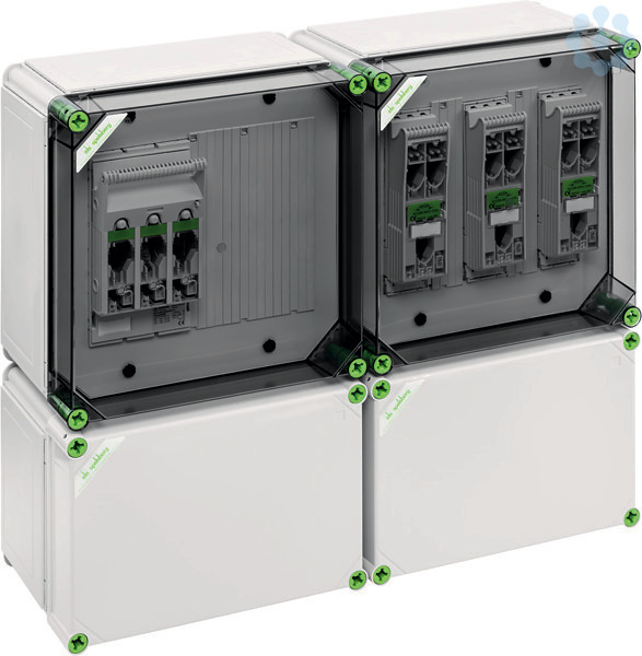 , bestehend aus: NH00-Reiter-Sicherungs-Lasttrennschaltergehäuse GST 2015-250, NH000-Reiter-Sicherungs-Lasttrennschaltergehäuse GST 2335-250, Flanschen mit metrischen Vorprägungen, zum Anschluss von 3 Wechselrichtern (3-phasig) bis max. 70 kVA GesamtleistungAbmessungen: 640 x 640 x 254mm