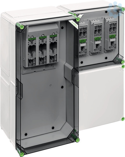 , NH1-Reiter-Sicherungs-Lasttrennschaltergehäuse GST 4116-250, NH000-Reiter-Sicherungs-Lasttrennschaltergehäuse GST 2335-250, Flanschen mit metrischen Vorprägungen, zum Anschluss von 3 Wechselrichtern (3-phasig) bis max. 140 kVA GesamtleistungAbmessungen: 640 x 640 x 254mm