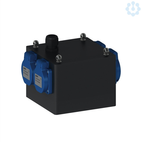 ELSPRO-Vollgummi-Hängeverteiler, Baureihe ESSEN, Eingang: 1 Kabelverschraubung M20 von oben, Ausgang: 4 Schutzkontaktsteckdosen, ohne Absicherung, jedoch, * werden gemeinsam über eine RCD 25 A/30 mA/2 pol. geführt, Ausführung: - K2 Ausführung, - schutzisoliert und spritzwasssergeschützt, - die RCD ist von außen zugänglich und liegt geschützt hinter einem Sichtklappenfenster, - Verteiler mit 4 Aufhängeösen