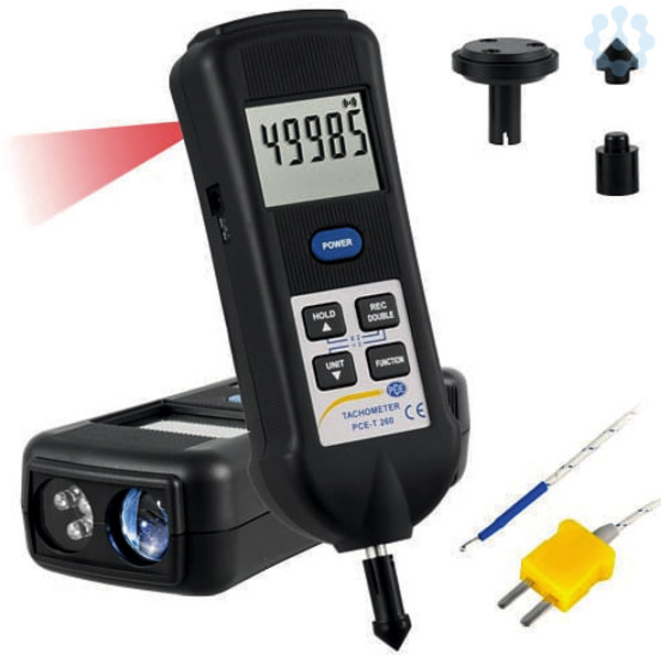 Das Handtachometer / Stroboskop ist ein Messgerät für den Einsatz in Wartung, Instandhaltung und Produktion. Neben der Stroboskopfunktion verfügt das Handtachometer / Stroboskop auch über die Möglichkeit Drehzahlen kontaktierend abzunehmen und Temperaturen zu Messen. Somit ist das Handtachometer / Stroboskop ideal zum Testen der Umdrehungsgeschwindigkeiten und Temperaturen von Zentrifugen, Motoren, Ventilatoren u. vieler anderer in Industrie und Forschung eingesetzter Maschinen und Anlagen geeignet. Dabei liegt die besondere Eigenschaft in der Kombination dieser Messparameter in einem Gehäuse. Das Handtachometer / Stroboskop hat einen Messbereich von 0,5 ...99.990 U/min, durch die IC-Schaltung in Verbindung mit einer hellen rotfarbenen LED-Lampe hat das Gerät einen geringen Stromverbrauch und ist nahezu wartungsfrei. Die Einstellung für das Handtachometer / Stroboskop erfolgt über Drucktaster (für Grob- und Feineinstellung). Das Handtachometer / Stroboskop ermöglicht darüber hinaus die kontaktlose Messung d