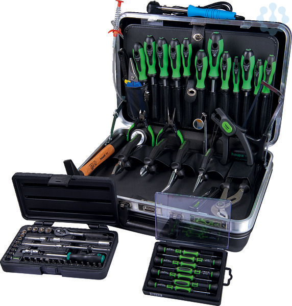 Das ideale WerkzeugsortimentHartschalenkoffer, schwarz, hochwertige Beschläge, bestückt mit 32 Werkzeugen. Koffer 220068.Inhalt: ? 2K-Kombizange 180 mm ? 2K-Seitenschneider 160 mm ? 2K-Telefonzange 160 mm ? 2K-Telefonzange 200 mm gebogen ? 2K-Wasserpumpenzange isoliert ? ESD-Elektronik-Seitenschneider 115 mm ? ESD-Elektronik-Flachrundzange 130 mm ? 2K-Elektriker-Schraubendreher 2,5 x 75, 4 x 125, 5 x 150 mm ? 2K-Werkstatt-Schraubendreher 6 x 100, 8 x 150 mm ? 2K-Schraubendreher PH 0, 1 + 2 ? 2K-Steckschlüssel SW 7, 8, 10 ? 2K-Stechahle vierkant ? Abisolierzange 0,5 - 4 mm2 ? Starrer Krallengreifer Gr. 165 ? Elektroniklot Sn 60% 1,5 mm 100 g ? VDE/GS Spannungsprüfer 125 - 250 V ? Elektronik-Schraub.-Satz 7-teilig ? Steckschlüsselsatz 1/4? 33-teilig ? Kabelmesser Kunststoffschalen ? Kontrollspiegel 210 mm ? Kontaktlöter 30 Watt ? Schlosserhammer 300 g ? Universalschere 190 mm ? Uni-Säge, schwer 150 mm ? Pinzette gebogen 115 mm
