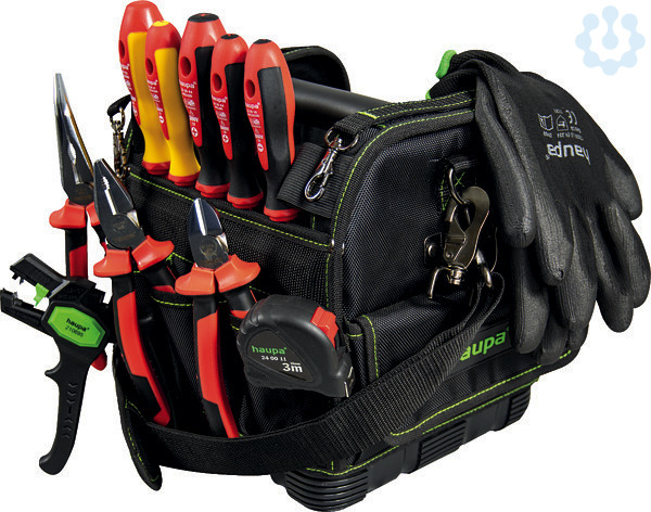 Werkzeugtasche aus 600D Polyester, mit Einsteckfächern innen und außen, mit gepolstertem Tragegurt, Bodenschutz mit Gummi verstärkt, doppelte Kreuznaht. Tasche 220703.? Automatische Abisolierzange ?Super Plus? 0,2 ? 6 mm² ? VDE-Elektriker-Schraubendreher HUPslim 4 x 100 mm, Klingenstärke je 0,8 und 1,0 mm ? VDE-Schraubendreher HUPslim PH, Größe 1 + 2 ? VDE-Schraubendreher HUPslim PZ/FL, Größe 2 ? VDE-Storchschnabelzange, abgewinkelt 45°, 200 mm ? VDE-Seitenschneider 160 mm ? VDE-Kombizange 180 mm ? Maßband 3 m ? PU-Textilhandschuhe, Größe 9
