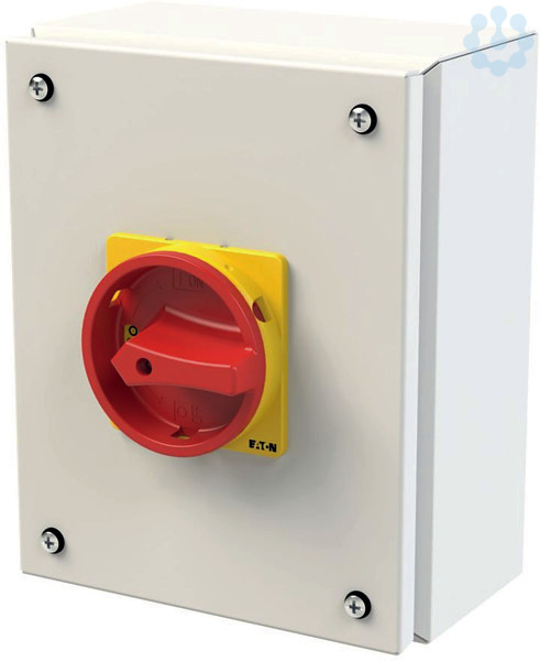 Hauptschalter, P3, 100 A, Aufbau, 3-polig + N, NOT-AUS-Funktion, mit rotem Drehgriff und gelbem Sperrkranz, abschließbar in 0-Stellung, im Stahlgehäuse