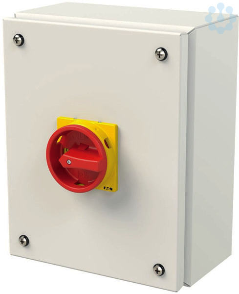 Hauptschalter, T0, 20 A, Aufbau, 4 Baueinheit(en), 8-polig, NOT-AUS-Funktion, mit rotem Drehgriff und gelbem Sperrkranz, abschließbar in 0-Stellung, im Stahlgehäuse