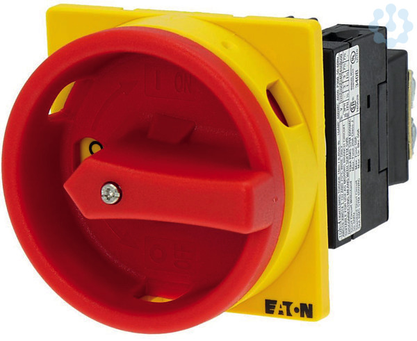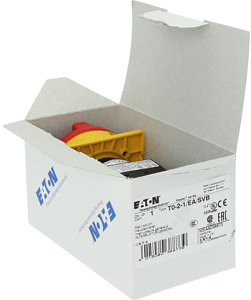 Hauptschalter, Sortiment: Hauptschalter, Wartungsschalter, Reparaturschalter, Typkenner: T0, STOPP-Funktion: NOT-AUS-Funktion, mit rotem Drehgriff und gelbem Sperrkranz, 3-polig, Abschließbarkeit: abschließbar in 0-Stellung, Schutzart: Front IP65, Bauform: Einbau, Schaltwinkel: 90 °, Bemessungsbetriebsleistung AC-23A, 50 - 60 Hz 400 V: P = 5.5 kW, Bemessungsdauerstrom: Iu = 20 A, 2 Baueinheit(en), Normen und Bestimmungen: IEC/EN 60947, VDE 0660, IEC/EN 60204, CSA, UL, Lasttrennschalter nach IEC/EN 60947-3