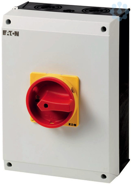 Hauptschalter, Sortiment: Hauptschalter, Wartungsschalter, Reparaturschalter, Typkenner: T5, STOPP-Funktion: NOT-AUS-Funktion, mit rotem Drehgriff und gelbem Sperrkranz, 6-polig, Abschließbarkeit: abschließbar in 0-Stellung, Schutzart: IP65, Bauform: Aufbau, Schaltwinkel: 90 °, Bemessungsbetriebsleistung AC-23A, 50 - 60 Hz 400 V: P = 55 kW, Bemessungsdauerstrom: Iu = 100 A, 3 Baueinheit(en), Normen und Bestimmungen: IEC/EN 60947, VDE 0660, IEC/EN 60204, Lasttrennschalter nach IEC/EN 60947-3
