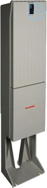 Hausanschlusssäule, Baureihe 142, 1x3NH2, Zu: 35-240 mm2, Ab: 25-95 mm2. Bestückte Verteilersäule als Hausanschlusssäule, Schutzart IP 44, mit Eingrabsockel, aus glasfaserverstärktes Polyester FS 833.5 nach DIN EN 14598 mit Recyclat. Profiliertes Gehäuse im Rippendesign. Mit NH-Sicherungsunterteil und Berührungsschutzabdeckung, aushängbare Stecktüren, Einfachschließung mit Profilhalbzylindern (Grundausführung), andere Schließung je nach VNB-Ausführung. Die Belüftung erfolgt über labyrinthartig ausgebildete Lüftungskanäle und ist durch Eindringen von Fremdkörpern stochersicher. Eingrabsockel und Verteilersäule bilden eine Einheit. Ein Bodenrost ist empfohlen. Zur Betauungsvermeidung ist der Sockel bis zur Höhe der Kabelbefestigungsschiene innen mit Sockelfüller aufzufüllen.