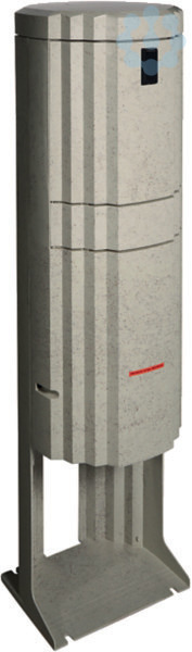 Hausanschlusssäule, Baureihe 135, 1x3NH2, Durchschleif-Variante. Bestückte Verteilersäule rund als Hausanschlusssäule, Schutzart IP 44, mit Eingrabsockel, aus glasfaserverstärktes Polyester FS 833.5 nach DIN EN 14598 mit Recyclat. Profiliertes Gehäuse im Rippendesign. Mit NH-Sicherungsunterteil und Berührungsschutzabdeckung, aushängbare Stecktüren, Einfachschließung mit Profilhalbzylindern (Grundausführung), andere Schließung je nach VNB-Ausführung. Die Belüftung erfolgt über labyrinthartig ausgebildete Lüftungskanäle und ist durch Eindringen von Fremdkörpern stochersicher. Eingrabsockel und Verteilersäule bilden eine Einheit. Ein Bodenrost ist empfohlen. Zur Betauungsvermeidung ist der Sockel bis zur Höhe der Kabelbefestigungsschiene innen mit Sockelfüller aufzufüllen.