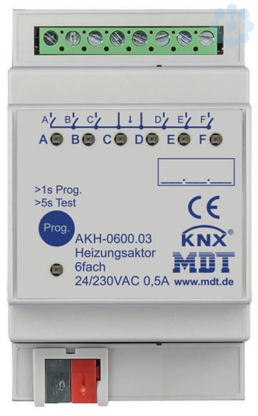 Heizungsaktor 6-fach, 3TE, REG, 24-230VAC. Heizungsaktor zur Steuerung von elektrothermischen Stellantrieben, mit LED Anzeige je Kanal. Neue Generation mit Funktionserweiterung. Jeder Kanal kann bis zu 4 Stellantriebe (230VAC) steuern. Freie Zuordnung der Ausgänge zum Regler Kanal. Ansteuerung mit 1Bit (Schalten/PWM) / 1Byte (stetig) Stellgrößen oder direkte Ansteuerung mit Temperaturwert über KNX Bus. Integrierter PI Temperaturregler (Heizen und Kühlen). Komfort-, Nacht-, Frostschutzbetrieb. Sommer-/Winterbetrieb. Sollwertverstellung mit 1Bit +/-, 1Byte oder 2Byte Absolutobjekt. Unabhängige Sollwertvorgabe für Komfort / Standby / Nacht. Speicherung der Sollwerte bei Busspannungsausfall. Notbetrieb bei Ausfall der zyklischen Stellgrößen. Überlastschutz mit Störmeldeobjekt (230VAC). Spannungsausfallerkennung mit Störmeldeobjekt (230V). Objekte für Heizungsanforderung sowie Festsitzschutz. Umfangreiche Szenenfunktionen. Kompatibel zu vielen Visualisierungen. Mindestvorlauftemperatur. Klartextdiagnose je Kanal m