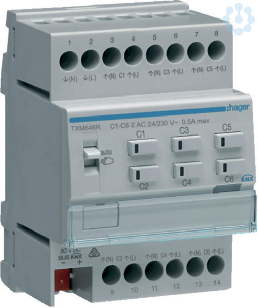 Heizungsaktor 6fach KNX easy, mit Regler für 24/230V Stellantriebe, Triac. Heizungsaktor (REG) mit 6 elektronischen Ausgängen (Triac) zur geräuschlosen Ansteuerung von elektrothermischen Stellantrieben für Heizanlagen oder Kühldecken. Bestehend aus Reiheneinbaugerät mit integriertem Busankoppler, Busanschluss über KNX Anschlussklemme, Schiebeschalter auto/Hand, 6 Handtasten für Auf/Zu je Aktorkanal mit Status LED (Default, Kurzschluss, Überlast), Programmiertaste mit integrierter LED, Beschriftungsfeld und Schraubklemmen für Ein- und Ausgangsspannungen. Funktionen: Ausgangsspannung für kompatible Ventile 230 V AC oder 24 V AC, Temperaturregler für Heizen und Kühlen, mit 12 Temperaturreglern zur Steuerung von bis zu 12 unabhängigen Zonen, Ein/Aus oder PWM-Steuerung. Handbedienung über Schiebeschalter des Kanals mit 0 % - 50% - 100%. Diagnosefunktion über Ausgang mit mehrfarbiger LED und Sommer-/Winterbetrieb. Sollwerte für Normal-, Zwangs- oder Not-Betrieb. Zyklische Überwachung/Erkennung der Eingangssignale v