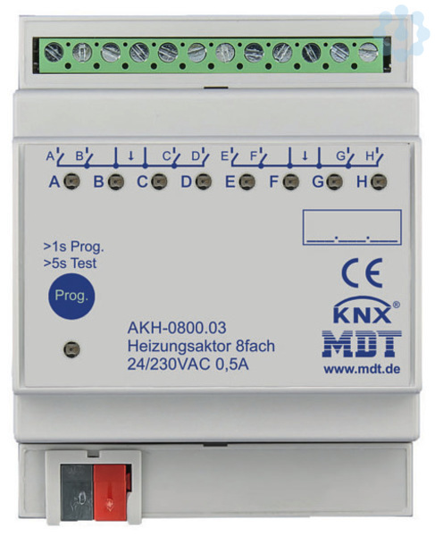 Heizungsaktor 8-fach, 4TE, REG, 24-230VAC. Heizungsaktor zur Steuerung von elektrothermischen Stellantrieben, mit LED Anzeige je Kanal. Neue Generation mit Funktionserweiterung. Jeder Kanal kann bis zu 4 Stellantriebe (230VAC) steuern. Freie Zuordnung der Ausgänge zum Regler Kanal. Ansteuerung mit 1Bit (Schalten/PWM) / 1Byte (stetig) Stellgrößen oder direkte Ansteuerung mit Temperaturwert über KNX Bus. Integrierter PI Temperaturregler (Heizen und Kühlen). Komfort-, Nacht-, Frostschutzbetrieb. Sommer-/Winterbetrieb. Sollwertverstellung mit 1Bit +/-, 1Byte oder 2Byte Absolutobjekt. Unabhängige Sollwertvorgabe für Komfort / Standby / Nacht. Speicherung der Sollwerte bei Busspannungsausfall. Notbetrieb bei Ausfall der zyklischen Stellgrößen. Überlastschutz mit Störmeldeobjekt (230VAC). Spannungsausfallerkennung mit Störmeldeobjekt (230V). Objekte für Heizungsanforderung sowie Festsitzschutz. Umfangreiche Szenenfunktionen. Kompatibel zu vielen Visualisierungen. Mindestvorlauftemperatur. Klartextdiagnose je Kanal m