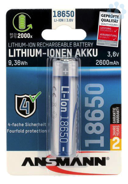 Hochwertige ANSMANN Lithium Akkus der Größe 18650 mit einer Spannung von 3,6V und einer Kapazität von 2600 mAh, ideal geeignet für den Einsatz in modernen LED-Taschenlampen, Stirnlampen, E-Zigaretten, Laser-Stifte, etc., besonders sicher dank integrierte Schutzbeschaltung mit Schutz vor Überladung, Überlast, Kurschluss und Tiefentladung, 2 Jahre Garantie