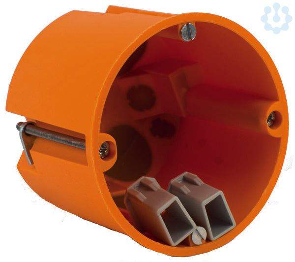 Hohlwand-Geräteverbindungsdose, für die Verwendung in Niedrigenergiehäusern, winddicht durch Membran, Material: Polyprobylen PP und TPE, feuerbeständig bis 850° nach VDE 606, Durchmesser: 68 mm, Tiefe: 61 mm, für Plattenstärke von 7-35 mm, Schutzart: IP40, Farbe: Orange.