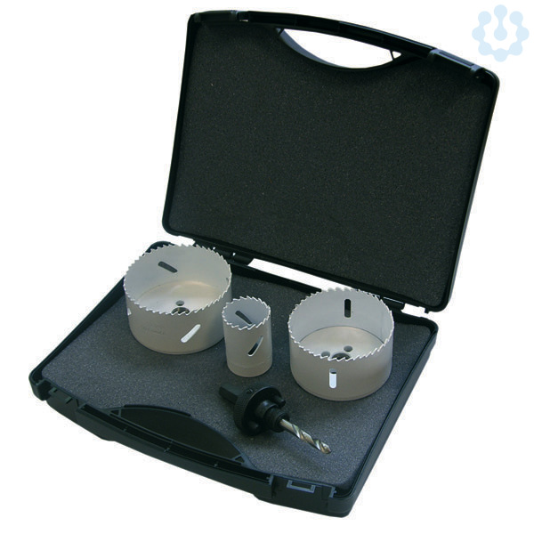 HSS-BI-Lochsägensortimentfür schnelle und präzise Löcher in Metall, mit Nägeln durchsetztes Holz, Sperrholz, Faserplatten, Kunststoffe, Rohre, Platten und Asbest. Nachfräsbar, zum Einsatz auf Hand- und Ständerbohrmaschinen, Combi-Zahnung, Ø 68/82 mm bzw. Ø 35/68/75 mm mit Aufnahmehalter und Führungsbohrer im Set. 2 bzw. 3 Lochsägen