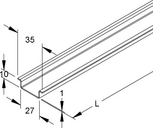 Niedax Tragschiene Modell 2935, Tragschiene TS 35 Anschlußmaße entsprechen DIN EN 60715, 10 mm hohe Ausführung, ungelocht, bandverzinkt nach DIN EN 10346, zur Schnellbefestigung von Installationsgeräten und Reihenklemmen. Abmessungen (ca. Maße) H x t : 10 x 1 mm Befestigungsmaß B : 27 mm TS Aufrastmaß B1 : 35 mm Lieferlänge L : 2000 mm