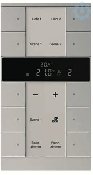 Frei konfigurierbares Multifunktionsbedienelement. Mit integriertem KNX-Busankoppler. Mit Beschriftungsfeld. Unterstützung der KNX-Funktionen durch innovatives Farbkonzept (gelb=Beleuchtung, blau=Jalousie, orange=RTR, magenta=Szene und weiß=neutral/keine Funktionszuordnung) oder Standardbeleuchtung rot/grün. Tasterfunktion: Schalten / Dimmen / Jalousie /Wert senden / Lichtszenen u.a. Master-/Slavebetrieb. Mit Grundlastbetrieb. Der Regler ist ein stetiger Raumtemperaturregler für Ventilator-Konvektoren (Fan Coil) in 2- und 4-Rohr Anlagen und konventionellen Heiz- oder Kühlanlagen Die Lüfterstufe kann manuell oder in den Automatikbetrieb geschaltet werden Klasse des Temperaturreglers: 1 Beitrag zur Raumheizungsenergieeffizienz: 1,0%. Anzahl Busteilnehmer: 1 Bei Bedarf entnehmen Sie bitte die programmierbaren Funktionen aus der aktuellen Applikationsbeschreibung die Sie von unserer Internetseite www -jaeger.de herunterladen können. Passende Beschriftungssoftware unter www.BUSCH-JAEGER-Beschriftungstool.de.