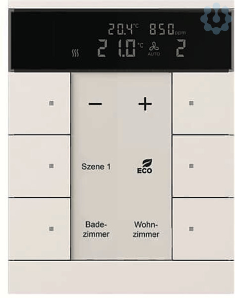 Bedienelement mit Raumtemperaturreglerfunktion und CO2-/Feuchtesensor. Mit integriertem KNX-Busankoppler. Mit Beschriftungsfeld. Unterstützung der KNX-Funktionen durch innovatives Farbkonzept (gelb=Beleuchtung, blau=Jalousie, orange=RTR, magenta=Szene und weiß=neutral/keine Funktionszuordnung) oder Standardbeleuchtung rot/grün. Tasterfunktion: Schalten / Dimmen / Jalousie /Wert senden / Lichtszenen u.a. Zur Ansteuerung von Heizungs-, Lüftungs- und FanCoil-Aktoren. Master-/Slavebetrieb. Mit Grundlastbetrieb. Die Lüfterstufe kann manuell oder in den Automatikbetrieb geschaltet werden Klasse des Temperaturreglers: 1 Beitrag zur Raumheizungsenergieeffizienz: 1,0%. Anzahl Busteilnehmer: 2 Bei Bedarf entnehmen Sie bitte die programmierbaren Funktionen aus der aktuellen Applikationsbeschreibung die Sie von unserer Internetseite www -jaeger.de herunterladen können. Passende Beschriftungssoftware unter www.BUSCH-JAEGER-Beschriftungstool.de.