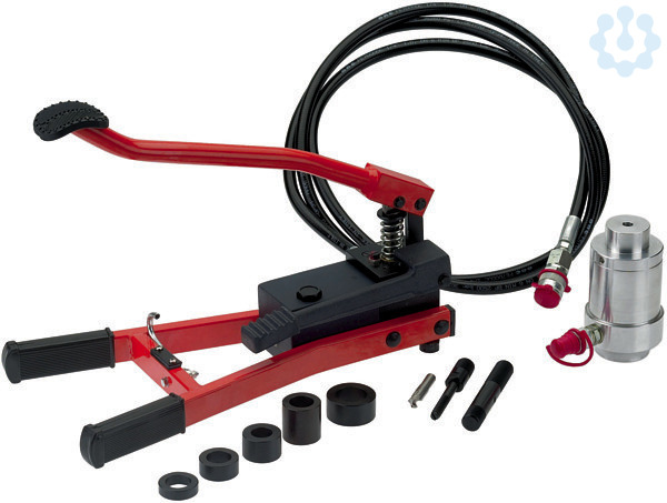 Hydraulische Stanze mit Fußpumpe Ideal bei beengten Platzverhältnissen für Rund-, Rechteck- und Quadrat-Stanzungen im Schaltschrank- und AnlagenBau. Beide Hände frei für genaues Positionieren und Stanzen - Gespreiztes Trägergestell sichert kippstabiles Arbeiten Stanzkraft 75 kN mit Ã?berdruckventil Betriebsdruck max: 700 bar - Tankvolumen: 270 cm³ - NutzbaresÖlvolumen: 210 cm³ - Fördermenge: 1, 7 cm³ je Kolbenhub - Lieferumfang in stabilem Stahlblech-Koffer - Fußpumpe - Hydraulik-Zylinder mit Schnellkupplung - Hydraulik-Schlauch 2, 8 m - Zwei Hydraulik-Schrauben - Distanzbuchsen-Satz (5-teilig) - Vorbohrer, 11, 0 mm