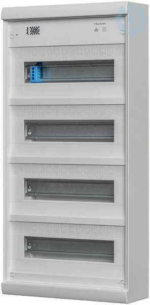 Aufputz-Kleinverteiler, ohne Tür, mit Steckklemmen,. PE 6 x 2,5 - 16 + 21 x 1,5 - 4 qmm . N+N 2x (3 x 2,5 - 16 + 14 x 1,4 - 4 qmm). zusätzliche N-FI-Klemme 3 x 16, 2 x 10 qmm. Abmessungen B x H x T (mm) 300 x 620 x 106. TE je 18 mm 48/56. Reihen 4. Aufputz-Kleinverteiler, ohne Tür. Schutzart: IP30. Für Geräte bis 63A. Verteiler-Bodenplatte aus Kunststoff, serienmäßig mit Fixierung für die Zu- und Abgangsleitungen sowie Vorprägungen für rückseitige und seitliche Leitungseinführungen . Vorprägungen für Kabelkanäle. Gerätereihen für 12 TE (auf 14 TE erweiterbar). Farbton: RAL 9016 (verkehrsweiß). Gebaut nach DIN VDE 0603-1, DIN 43871. PE/N-Klemme mit +, - Schrauben, berührungssicher, mit montagefreundlicher Verrastung des PE+N-Trägers. Ab 2-reihiger Ausführung mit zusätzlicher FI-N-Klemme. Für Einbaugeräte von 51 bis 68mm. Mit abgesenkter Gerätetragschiene (Zubehör) auch Einbaugeräte bis 88mm einsetzbar. Volltür als optionales Zubehör. Volltüren:. Aus Stahlblech, pulverbeschichtet. Serienmäßig mit Türbetätigung