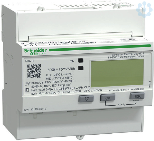 Acti 9 iEM3000 Baureihe. iEM3210 Energiezähler, 3-phasig,mit Teilzähler. Ausgang_S0 1, MID Ja, max. Bemessungsstrom 1 / 5. Drehstromzähler für Wandlermessung x/1 A bzw. x/5 A bis 6300 A. Anzeige vollgraphische LCD-Anzeige zur gleichzeitigen Klartextdarstellung von Menüpunkt/Messkategorie, Messwert, Einheit sowie aktivem Tarif. Teilzähler werden mit Zeitstempel (Datum&Uhrzeit) der letzten Rücksetzung angezeigt bzw. kommuniziert. Messfunktion Gesamt-Wirkenergiezähler ohne Resetfunktion und Teil-Wirkenergiezähler mit Resetfunktion. Weitere Bestelloptionen Verrechnungszählung MID konform gemäß EN 50470-3 (ehem. PTB-Zulassung), Wirkenergiezähler Gesamt und pro Phase. Schutzart Front IP 40, Gehäuse IP 20 (Hinweis zu MID Varianten für Konformität mit der Europäischen Messgeräterichtlinie MID 2004/22/EG muss das Messgerät in einem Schrank oder Gehäuse mit Schutzart IP51 oder besser verbaut sein).