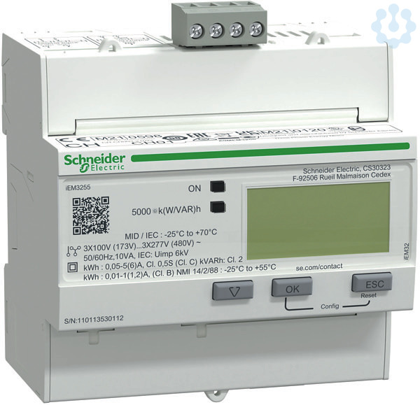 Acti 9 iEM3000 Baureihe. iEM3255 Energiezähler, 3-phasig, erweiterte Messfunktion, 1E/1A. Ausgang_K 1, COM Modbus, Eingang_K 1, MID Ja, max. Bemessungsstrom 1 / 5. Drehstromzähler für Wandlermessung x/1 A bzw. x/5 A bis 6300 A. Spannungswandler geeignet für Messungen > 480 V AC z. B. Mittelspannungsanwendungen. Anzeige vollgraphische LCD-Anzeige zur gleichzeitigen Klartextdarstellung von Menüpunkt/Messkategorie, Messwert, Einheit sowie aktivem Tarif. Teilzähler werden mit Zeitstempel (Datum&Uhrzeit) der letzten Rücksetzung angezeigt bzw. kommuniziert. Messfunktion Gesamt-Wirkenergiezähler ohne Resetfunktion und Teil-Wirkenergiezähler mit Resetfunktion. erweiterte Messfunktion für Energiezähler über Anzeige und Kommunikation Wirk-/Blindenergiezähler und Strom pro Phase, Wirkleistung, Leistungsfaktor gesamt, Spannungsmittelwert. Nur über Kommunikation Spannung, Wirkleistung pro Phase, Frequenz. Weitere Bestelloptionen Verrechnungszählung MID konform gemäß EN 50470-3 (ehem. PTB-Zulassung), Wirkenergiezähler Gesa