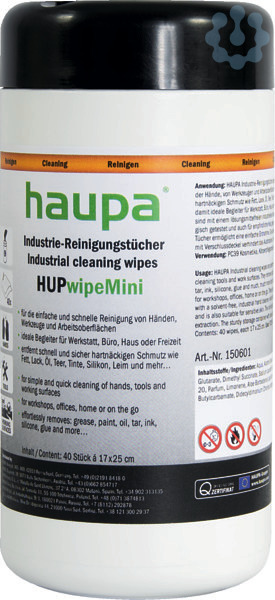 Industrie-Reinigungstücher HUPwipeMiniAnwendung: HAUPA Industrie-Reinigungstücher eignen sich hervorragend zum Reinigen der Hände, von Werkzeugen und Arbeitsoberflächen. Sie entfernen schnell und sicher hartnäckigen Schmutz wie Fett, Lack, Öl, Teer, Tinte, Silikon, Leim und mehr und sind damit ideale Begleiter für Werkstatt, Büro, Haus oder Freizeit. Diese praktischen Tücher sind mit einem lösungsmittelfreien industriellen Handreiniger imprägniert, dermatologisch getestet und auch für empfindliche Haut geeignet. Die Perforation der einzelnen Tücher ermöglicht eine einfache Entnahme. Die praktische stabile Aufbewahrungsdose mit Verschlussdeckel verhindert das Austrocknen. Inhalt: 40 Tücher á 17 x 25 cm. Eigenschaften: Entfernt mühelos: Fett, Lack, Öl, Teer, Tinte, Silikon, Leim und mehr ?? für die einfache und schnelle Reinigung von Händen, Werkzeuge und Arbeitsoberflächen ? ideale Begleiter für Werkstatt, Büro, Haus oder Freizeit ? entfernt schnell und sicher hartnäckigen Schmutz wie Fett, Lack, Öl, Teer, Tin