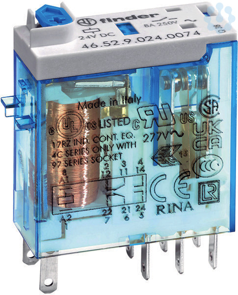 Miniatur-Steckrelais, 2 Wechsler(AgNi) für 8 A / 250 V AC, Spulendaten: 24 V DC, 0,5 W 1200 Ohm, Relaisschutzart: RT I, feststellbare Handprüftaste, mechanische Anzeige.