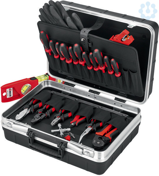 Robuster Werkzeugkoffer Funktion aus stoßfestem Kunststoff mit stabilem Aluminiumrahmen, Zwei robuste, abschließbare Kippschlösser, Bodenschale im Spritzgussverfahren hergestellt mit zahlreichen Unterteilungsmöglichkeiten, Herausnehmbare Bodenabdeckplatte, einseitig mit Werkzeugtaschen bestückt, Herausnehmbare Werkzeugtafel mit Dokumentenfach und einer Vielzahl von Werkzeugeinsteckfächern, Größe: L x B x H: 395 x 455 x 205 mm, Gewicht: leer 3.450 g, Werkzeugkoffer-Bestückung: 1 x VDE-Kabelschere, für Kabel 18 mm², 1 x 1000 V Kraft-Seitenschneider 200 mm, 3 x VDE-Schlitz-Schraubendreher SLIM, 2 x VDE -Schraubendreher mit Kombiprofil SLIM, 2 x VDE-Kreuzschlitz(PZ)-Schraubendreher SLIM, 4 x VDE-TORX®-Schraubendreher SLIM, 1 x Elektronik-Seitenschneider ohne Schneidwate 132 mm, 1 x Universal-Schaltschrankschlüssel, 1 x Profi-Schaltschrank-Wasserwaage 250 mm, 1 x Automatische Abisolierzange für flexible Leiter, 1 x Presszange Click`n`Crimp, 1 x Steckschlüssel-Bit-Halter, 1 x Spannungsprüfer 690 V, 1 x Bit-Box, 10-